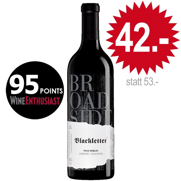 Broadside, Blackletter, Cabernet Sauvignon; Paso Robles. Der Broadside Blackletter ist ein üppiger aber gut balancierter Blend aus zwei Paso Robles Appellationen. In der Nase intensive Aromen von Cassis und Brombeeren. Im Gaumen schwarze Kirschen, Pflaumen und schwarzen Oliven. Dieser Wein wird sich nach dem dekantieren noch während Stunden weiter öffnen. 93% Cabernet Sauvignon, 7% Petit Verdot. 94 Punkte Wine Enthusiast. 15,5% Alk.